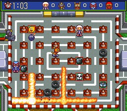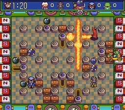 The mandatory Bomberman arrow stage, where kicked bombs follow in the direction the arrows point. The four arrows in the middle changes position to keep you honest