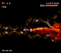 Take the lift down. As you descend, flames and drillers attack. Make your way deeper in the base. Doors fall down (reminded me of the classic HANGAR stage in NES Contra). Blow 'em up. Stationary machines hang off of the ceilings and threaten with their deadly flame throwers. No boss here. Board the space ship...