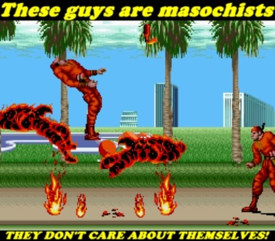 Are you a sadistic and bloodthirsty game player? Do you enjoy partaking in the odd boisterous barbaric brutality? If you answered yes, then you sir probably enjoy the classic beat 'em up genre. The good news: SNES is loaded with them. Take control of the Lee brothers, the Battletoads, ninjas and knights, heck, even Batman! Final Fight was the very first to hit the SNES; it helped pave the way for the others. But any bad news? Hmmm, well... "Are those skull earrings?" "Why yes, Mommy got me 'em" "Cool, I have a pair just like that at home" "Yeah ain't they great. They accentuate my scar"