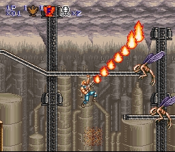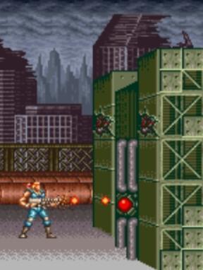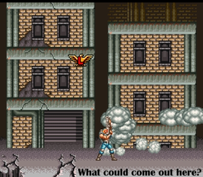 From the very start players enter a post apocalyptic war-torn universe overran with alien forces. From blowing up cars and towers, to hitching rides on tanks and getting through a flame-engulfed section, the stage is set beautifully for one epic and intense action fest. The graphics are often impressive and at times, they are TRULY spectacular. The music is brilliant, with an excellent mixture of metallic guitars and big orchestral pieces. It's not quite the masterful soundtrack as Konami's other hit SNES title Super Castlevania IV, but it's right up there, with loud explosions that will make you cheer in your seat as you blow away the alien forces chunk by bloody chunk. The sampled grunts and screams work and the overall effect is a sonic feast. It REALLY is everything you hoped 16-bit Contra would be... and even, perhaps more "I'M KINDA BUSY OVER HERE MYSELF, SULLY!"