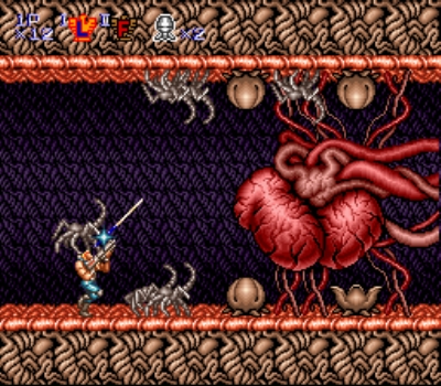Thankfully, Contra III continued Konami's masterful execution of featuring bosses that made us quiver in our seat, even if we didn't admit it to our friends. From the very first sight of the very first boss, that menacing mutated snapping turtle, bursting out of the bloody walls and pulsating all over the place like a spazzed druggie, you knew two things. One, you would never forget the image. And two, Konami still had it. They still had that magic touch. The first thing that comes to my mind whenever someone mentions Konami, are the many memorable bosses the firm has produced over the years, and Contra III is chock full of 'em!
