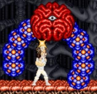 Who could ever forget this monstrosity from the NES game? Heh, I used to call him the "Long Neck Alien Monster." My brother, Uncle Jimmy and I loved killing this guy, and I always fought with my brother for the control pad here. When I think of Contra, this parasite here is always the very first bad guy that comes to mind. He blew our minds back in '88 and he wasn't EVEN a boss! Simply amazing design with just the right shade of demonic red. Those large orange shrimp baddies he spewed out had me boycotting eating shrimp for a good while too! Remember how you stood at the edge of that wretched pillar there, blasting away at his jaw while your buddy took care of the shrimp? I know you do. I know I do. There are video game enemies you remember for life. This is one of 'em