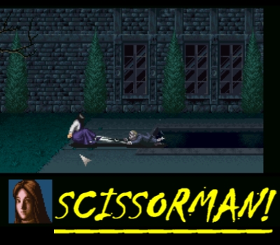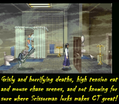 So of course, like a total imbecile, I explored the door I was in front of when it began to play. I found myself in a hazy bathroom, and looked at the various fixtures. The only thing the cursor responded to was the closed shower curtains. So again like an imbecile, I went to look. The tub was full, but the person in it was hanging from her wrists from the shower curtain's bar. Apparently it was one of the girl's friends, but I didn't have long to think about that. Suddenly this figure jumped out of the bathtub, brandishing a huge pair of scissors! It was a blue-skinned dwarfish being in a schoolboy's outfit, with a four-foot-pair of scissors. This was the beginning of my Clock Tower experience... -The Manx