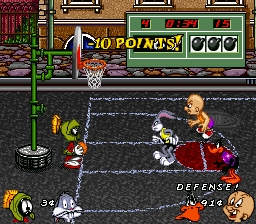 If you play with the Wacky Meter anywhere from 2 to 5, then you'll see gems randomly appear on the court throughout your game. Grab these gems so you have money to use special offensive plays that may aid you in victory. The Long special will cost players 10 cents (good deal!) and with this, players launch the ball beyond halfcourt. Of course, it's not automatic and it depends on how good your guy is from 3 point land, but with Long, the chances are pretty good that it goes in, even from full court! Each character has his own unique Long shot. Taz chews up the ball and spits it out, for example. Fun stuff