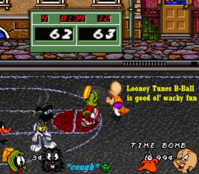 Looney Tunes B-Ball is just a fun zany game. It's very customizable -- you can play a serious straight up game, or flip to the other extreme. With 16 ton heavy ACME weights dropping out of the sky everywhere, Vegas slots, crossdressing, throwing cream pies and turning folks into a pile of dust, it really is NBA Jam meets Looney Tunes. OK so the basketball isn't the best around. You can't expect that though from this type of game. If you want a pure basketball sim, look elsewhere. But if you're looking for a fast, crazy, fun street ball type basketball game, this is the second best on the SNES behind the NBA Jam series. It's not a deep game by any means. There's no stat-tracking, no 82-game seasons -- just a simple versus mode and a tournament. And that's enough when the game is as fun as Looney Tunes B-Ball is. If you can round up three buddies, it becomes a completely different game, as it's meant to be played with your pals. Be prepared though for a many bruised egos
