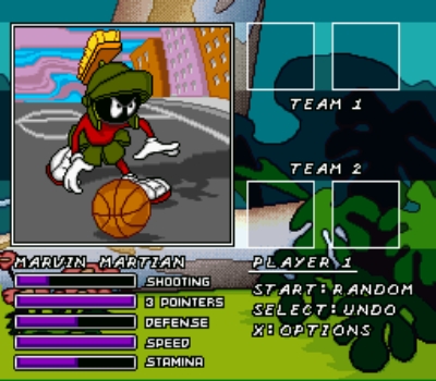 In the mid 1990s, NBA Jam thrilled and amazed game players across the nation. It was basketball like never before. Previous to Jam, many basketball games were serious and more simulation-based. NBA Jam really broke the ceiling and JAM appealed to even non-basketball fans, with its wild acrobatic dunks and frenetic gameplay. And then came Looney Tunes B-Ball, which can best be described as Looney Tunes meets NBA Jam. Quite a combo, eh? TOON-SHAKA-LAKA! [HE'S ON FI -- I mean, you're fired -Ed.]