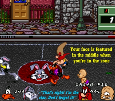 It just wouldn't be Looney Tunes if you didn't have a cream pie somehow involved. For 10¢ you can throw a cream pie straight ahead. If it hits your opponent he is momentarily stunned -- allowing you a clear pathway to the basket. Is there a downside? Well...