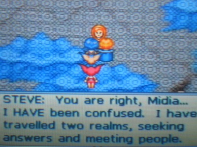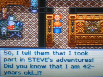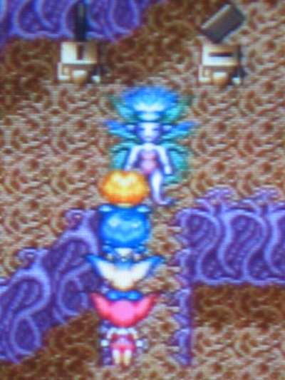I like the overworld map. You resemble a sort of SD version of yourself. Later in the game you can move around the map by riding that funky looking animal there, or a handy airship