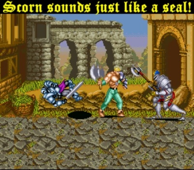 But there are some flaws, too. While the graphics are good, as is the music, the sound is a bit muted and doesn't have the kind of convincing slicing and slashing that you'd hope for. There is a small bit of slowdown (though mainly at the Iron Golem part) to work through and because the Arthurian bunch come armed with their weapons, there are none to pick up along the way. It's one of the genre's classic selling points for me... being able to pick up say, a Louisville slugger, or a lead pipe, but there's obviously none of that here. Another staple is the ability to grab, pound and throw. Sadly, you can't do that here. So, this game is, strictly, a slash 'em up. It offers less choices than your average beat 'em up, since there are no weapons to pick up along the way, and no way to throw enemies. This can get a little bit dull from time to time, but overall, it's a blast playing this with a friend. Someone who has your back and you have theirs. My cousin David and I recently played through this together, and despite its imperfections, Knights of the Round is a solid beat 'em up that has some unique ideas and deserves a spot in any beat 'em up fan's Super Nintendo library