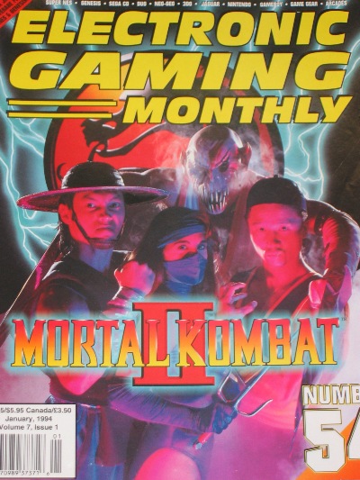 When Mortal Kombat first exploded onto the arcade scene in 1992, it made an IMMEDIATE IMPACT and MK became the talk of the town. Its unique digitized graphics, extreme violence and infamous FATALITIES left a lasting imprint. But there were many who felt the gameplay wasn't real special. And furthermore, there were quite a few who felt it was an empty shell of a fighting game. Then, the following year, Mortal Kombat II was unleashed, and it changed everything. More fighters, much more combos, more Fatalities and more secrets made it a game that even the anti-MK haters had to raise an eyebrow at. Now, not only did Mortal KombatII have the novelty factor going for it, but the gameplay, too. In December of 1993, my older brother Kevin began his subscription to EGM. Our first issue was # 54, January 1994. I will never forget coming home from school that one day, with dark clouds lingering overhead, opening my mailbox and seeing this striking cover staring right back at me. The game logo jumped off the cover, as though it were 3D. I couldn't take my eyes off of the menacing monster, Baraka. He was an odd combination of looking cool, yet also very cheesy. My mind couldn't process which one won out, but I knew it struck an emotional chord. As much as I loved Street Fighter II at the time, Mortal Kombat was the more violent and gritty alternative. It was like how ECW was to WWF in the mid 1990s. To this day I vividly remember standing there at my mailbox holding this issue in my hand and admiring the cover for what felt like 10 minutes. Finally, I decided I had better head in before the rain could come pouring down. Kev would have killed me. 20-plus years later, it remains a fond gaming memory from my youth