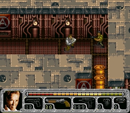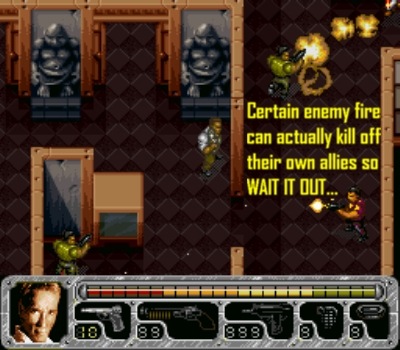 But make no bones about it, what really makes True Lies stand out is its sheer, unadulterated violence. It's loud. It's brash. It's grisly. Grenades send its victims sprawling 10 feet in the air as blood spills and bodies singe. It's a great game to pop in after a tough day at work, as few things satisfy like wasting bastards point blank via shotgun, followed by roasting someone alive. On the downside, it's way too difficult. The levels are LONG and can take 15-25 minutes to complete. (But this does make it an ideal game to pop in for a stage or 2 to get your quick fix). The later levels are maze-like, thus the time it takes to beat them. Some levels have you fetching items which impedes the shooting mayhem. Enemies always seem to know where you are, even if they can't see you. The lock button helps but a quick 180° turn option would have too. Angling your shots and positioning yourself properly is of utmost importance. But even if you do all of that, it'll STILL eat you up and spit you out. Thank goodness, then, for codes which allows for a far more fair playing experience. Despite its flaws, there aren't too many titles comparable to True Lies on the Super Nintendo. It's worthy of the Arnold name, providing wanton destruction the likes of which few others can match
