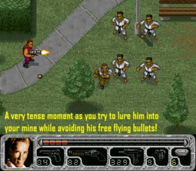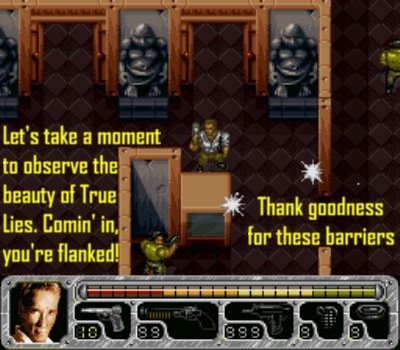 When asked to name the biggest action movie stars, Arnold Schwarzenegger is sure to be quoted. When asked about quality action shoot them up titles on the SNES, True Lies probably would not be credited, at least, not right away (if at all). That's a shame as it's one of the better movie to game adaptations on the SNES. Thirsting for a fun violent overhead shooter? True Lies may be the very sleeper you've been hoping to discover. Let us dive in... Film to game adaptations can often miss the mark. Not this one