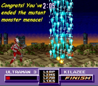 Ultraman is the first fighter ever on the SNES, and unfortunately, also one of the worst. You're relegated to controlling just Ultraman, there's no two player mode, limited move set, stiff control, Ultraman moves like he's got a load in his pants. Where's the agile karate kicking warrior as seen on the cover, eh? Sure, some monsters require small strategic changes in your fighting and defense style but due to the limited amount of moves at your disposal that strategy is extremely marginal. Visually, the game fares a bit better. Though the graphics didn't wow anyone, even back in '91, it's got a certain rubber monster charm to it. The sprites could be bigger though, and the lack of animation on the characters are quite a disappointment. On the plus side, the sound isn't too shabby -- filled with cheesy monster roars and sound effects that fit right in with the nature of this game. Some of the tunes are actually catchy. But... it's really not a good thing when a game's best quality is the art on the front cover