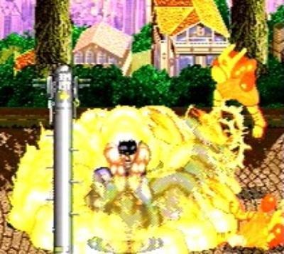 They resemble the Final Fight games more than Streets of Rage. It has a cartoony look, not a gritty one. Some animation is extremely lackluster. The game just doesn't have trademark A-Class animation. Especially Rando's moves; the animation on them is quite awkward-looking at first. The throws are also lacking animation. However, attention to detail is very nice in some areas. Knocked down poles will break into segmented pieces. Statues broken will shatter apart and cars demolished will flip wildly in the air with tires flying every which way. The flames look pretty nice. More cool details -- on the second stage, you'll see some sort of fish swimming in the water beneath you, nice touch. Although the artwork could have been better