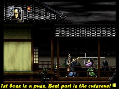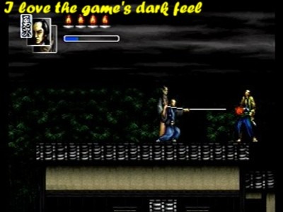 I like the fact that all the game's stages take place at night, making it a great game to pick up at night with the lights turned off. The visuals, the music, the mood, it all gives it a very somber vibe. The bosses pretty much blow, but I liked the boss hiding out upstairs being guarded by a protector who you'll have to go through. Hissatsu! is nothing special, but I think 16-bit fans may get a kick out of seeing this old school-ish title on their Saturn. It's got a certainsimple "Sega Genesis feel" to it. And truth be told, I really wish the Saturn had more 'basic' games like this. It doesn't come close to taxing the immense 32-bit horsepower of the Sega Saturn, and it feels like one of them hair-pulling 16-bit titles I played back in the early-mid '90s. I just don't think the Sega Saturn saw enough 2D action games. While Hissatsu! is only slightly above average at best, at least they tried. And damn, did I wish more companies put out games akin to this. Improved in the gameplay department, mind you, but I dig the 16-Bit vibe that bleeds out of Hissatsu!